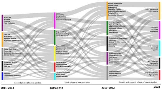 Fourth period (2019–now): Over the most recent period, various key topics have gained prominence, including governance, ecosystems, sustainable development, resource management, and policy- and decision-making. Some studies characterize the nexus as a governance concept that aims to integrate resource management and sectors through policies and regulations to enhance sustainability and improve resource allocation [24]. The nexus approach fosters policy integration and coherence by identifying optimal policy combinations and governance structures across nexus sectors [25]. It recognizes the importance of integration and interdependence among diverse sectors as a crucial step in ensuring resource security in the global context of rising and competing demands [26].