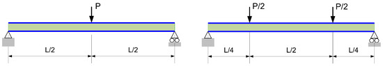 In the 3Pb bending test, the total load applied is (P), which is shared between the cells along the width of the top middle section. For the 4Pb bending test, two loading points of are located at a quarter from each support, see Figure 6. The supports are restricted, ensuring an isostatic configuration of the loaded beam.