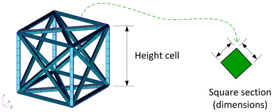 The side of the confining cube for each cell shown in Figure 1 is approximately 7 and equal for the three. The dimensions of the metamaterial core of the composite beams are , which means that each core has 4 cells in width, 4 cells in height and 42 cells in length.