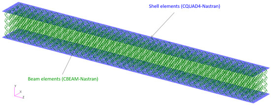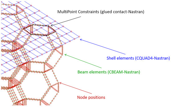 At the top and bottom of the beam, a shell with a thickness of 5 mm is placed to ensure a proper transmission of the point loads throughout the composite beam and to the metamaterial core. The thickness of the shell is determined to avoid punching and to allow the distribution of the supporting loads. Furthermore, the resulting final displacement field does not present localized deformations in any part of the model, but at the same time, the mechanical role of the shell in the global bending stiffness is also marginal. In the finite element model, the shell is modeled with a Nastran CQUAD4 element, and it is linked to the metamaterial beams through the “glued contact” of Nastran [102,103,104] by means of a set of permanent multipoint constraints which avoid the separation between skins and core during the deformation (Figure 5).