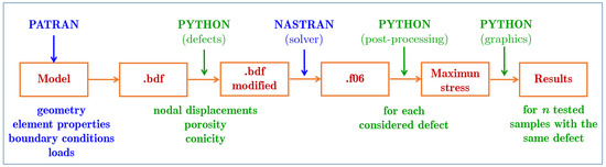 The computational modeling scheme for introducing defects is given in Figure 8. First, we use Patran to build the initial canonical model, including the geometry, properties, boundary conditions and loads. The program generates an output file (.bdf). This file is modified using a Python script that inserts the mentioned defects (separately or all together depending on the purpose of the analysis). Subsequently, the modified file (.bdf modified) is executed on Nastran [102,103], generating the solution file (.f06). This file is introduced in another Python script for post-processing, selecting the average and the maximum stresses. Finally, the results for the n tested samples are compiled, allowing for the representation of the stresses for each type of unit cell used in the beam.