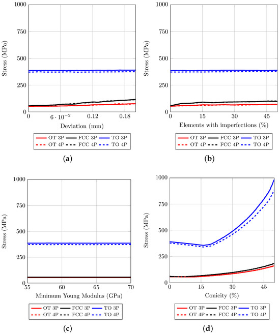 Figure 9a shows the results obtained when modeling this type of defect from the amount of nodal deviation. It is observed that, whereas the TO unit cell is the cell that sustains larger stress due to its geometric configuration, it is also the least affected by this imperfection since the maximum stress obtained is almost insensitive to it, with only a slight deviation between the 3Pb and the 4Pb bending tests.