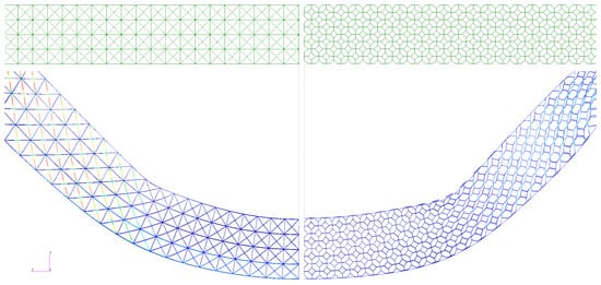 For this case, similar meshes as for the previous case are used. Following experimental observations over the geometry of the printed cells [7,114], where bars exhibit a nonconstant section area, the elements located in the corners of the edge are assigned the greatest amount of material, the macro elements in the central area have half the amount of that material, and the connection elements between the corner and the central area are modeled with 75% of the material assigned to the corner. This defect in the algorithm is implemented as a variation in the section of all edges of the unit cells that constitute the testing beam, as shown in Figure 7.