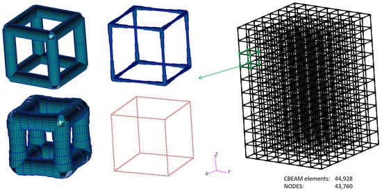 The final design of the finite element model with the commercial code Patran/Nastran [102,103,104] is performed pursuing a behavior of the composite sandwich beam balanced between the stiffness contribution of the cladding skins (where the bending axial forces dominate) and the stiffness contribution of the core (where the bending shear forces dominate). To this end, compliance with the standard described in the test method ASTMC393 is preserved. An example of the models with mm dimensions (i.e., cells) is shown in Figure 4, in this case with truncated octahedrons.