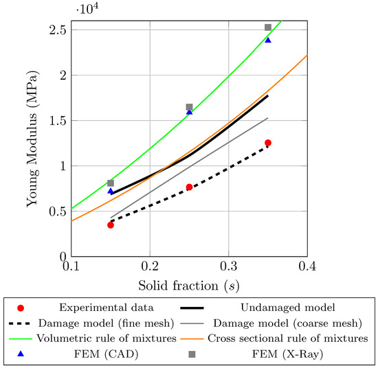 Figure 12 shows the modulus of elasticity versus the ideal solid fraction s. The red dots represent the experimental data of the printed model, incorporating the defects. The blue triangles represent the finite element model results (FEM) with the geometry obtained from the CAD model (Patran), while the gray squares represent the finite element model results, where the geometry applied on the finite elements is obtained using the data of X-ray tomography [116]. In both these meshes, the edge defects are not explicitly incorporated. The black line corresponds to the model without porosity, while the dashed black line and the gray line correspond to the models with porosity defects introduced. The difference between the latter lines corresponds to the mesh used, where the finer mesh has 12 elements per edge, whereas the coarser mesh has 6 elements per edge. Finally, the green and orange lines correspond to the rule of mixtures for the modulus of elasticity and the density of the model. The green line corresponds to the solid modulus of elasticity and the total density, whereas for the orange line, the same modulus is used, but the density is modified, being in this case that of the sectional area.