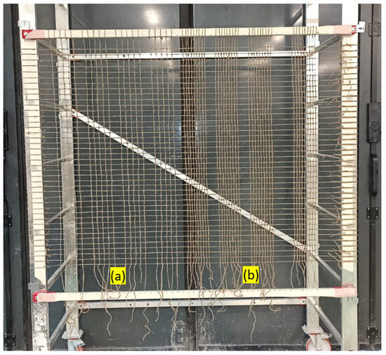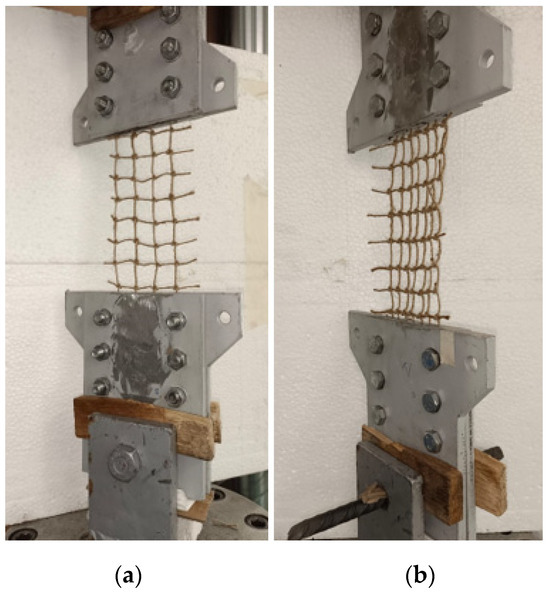 During this experimental campaign, the mechanical strength of the two types of jute nets, with 2.5 cm × 2.5 cm and 2.5 cm × 1.25 cm mesh configurations, were evaluated through tensile strength tests.