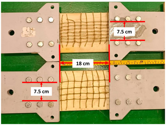 The length of each tested sample with net mesh types 2.5 cm × 2.5 cm and 2.5 cm × 1.25 cm, were 0.5 m long. About 18 cm of net (Figure 3) was exposed to the applied loads. The net samples are placed inside two clamps, as shown in Figure 4, and the top and the bottom fixtures were tied with a torque wrench with an adjustable pre-set torque value of 50 N/m (Figure 4), this was performed to bind the edges of the net uniformly with quasi-equal force.