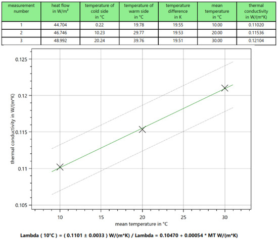 According to EN 12939 [83], the tests were carried out at sample mean temperatures equal to 10 °C, 20 °C, and 30 °C (Figure 9), always maintaining a difference of 20 °C between the two plates. Consequently, the TC values were calculated based on Equation (1), using the measured heat fluxes values: