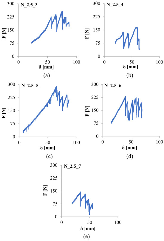 Force–displacement graphs of the jute net (a) Sample N_2.5_3, (b) Sample N_2.5_4, (c) Sample N_2.5_5, (d) Sample N_2.5_6 and (e) Sample N_2.5_7, with fiber mesh 2.5 cm × 2.5 cm configuration.