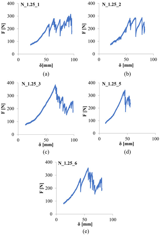 Force–displacement graphs of the jute net (a) Sample N_1.25_1, (b) Sample N_1.25_2, (c) Sample N_1.25_3, (d) Sample N_1.25_5 and (e) Sample N_1.25_6, with fiber mesh 1.25 cm × 2.5 cm configuration.