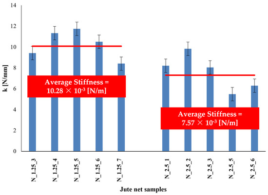 Figure 12 presents a comparison of the stiffnesses between the jute net mesh configurations 2.5 cm × 1.25 cm and 2.5 cm × 2.5 cm. It is clearly noticeable that the first configuration is stiffer than the latter configuration. The maximum and minimum stiffness for the 2.5 cm × 1.25 cm mesh configuration was found to be 11.75 N/mm and 8.41 N/mm, respectively. While 9.83 N/mm and 5.48 N/mm are the maximum and minimum stiffness for the 2.5 cm × 2.5 cm mesh configuration.