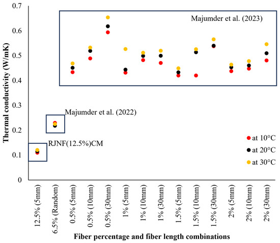 The TC values of RJNF(12.5%)CM sample were compared to the sample combinations with different fiber percentages (0.5%, 1.0%, 1.5%, and 2.0%) and fiber lengths (30 mm, 10 mm, and 5 mm), as highlighted in [75]. The TC values of the RJNF(12.5%)CM are lower in the range between 74% and 80% approximately, with respect to the samples mentioned [75].