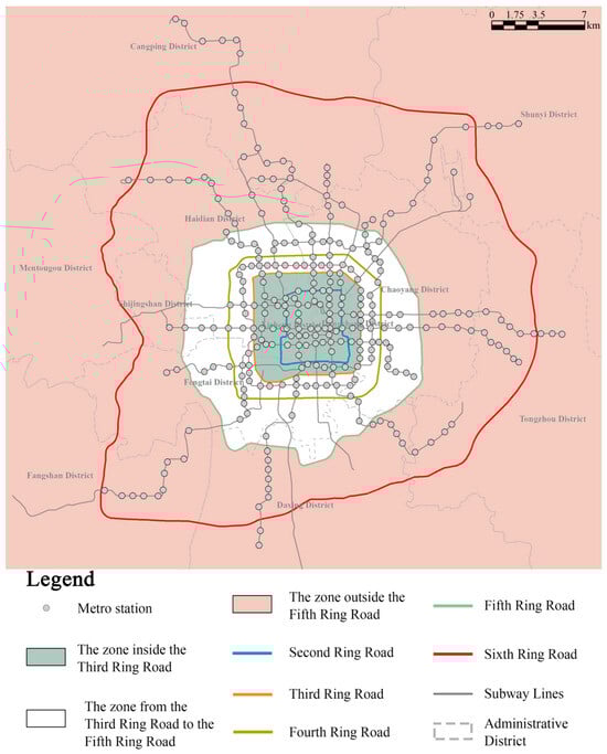 Rail transit helps reduce dependence on automobiles, alleviate traffic congestion [1,2,3], and improve road safety [4]. Therefore, its construction and operation are highly valued by urban decision-makers [5,6]. As the capital of China, Beijing’s subway planning and operations have strong reference significance for the entire country, and even for developing countries. By 2020, Beijing’s metro mileage had reached 689 km. Therefore, Beijing has a high research value. Beijing’s road system has developed rapidly over the past 30 years, expanding from the 2nd Ring Road to the current 6th Ring Road. Simultaneously, traffic problems have become increasingly serious, prompting more and more residents to opt for public transportation. According to the Fifth Comprehensive Transportation Survey of Beijing [7], the proportion of car trips dropped for the first time, and the proportion of public transportation trips rose. However, due to the supply and demand imbalance, some metro stations experience high ridership while others have low vitality. It has become increasingly important to ensure that rail transit can meet the commuting needs of urban residents [8]. Metro ridership has been shown to be affected by explanatory variables selected based on the built environment 3D, 5D, and 7D [9,10,11], which is a crucial aspect of the city. Therefore, it is essential to analyze the built environment’s impact on ridership to plan and operate a metro system [12].