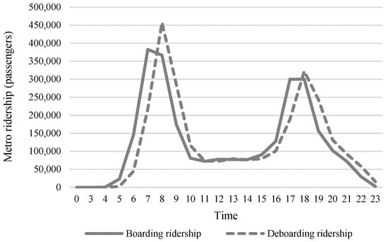 This study focuses on the 292 metro stations that have been put into service on the 19 metro lines that were in operation in Beijing by 2020 (compared with the metro operation stations published on the official website of Beijing Metro, the subway stations we selected have been in operation since 2020). We found that metro stations inside the 3rd ring are relatively clustered, those from the 3rd to the 5th ring are less clustered, and some of them are distributed parallel to the ring road, while those outside the 5th ring are more dispersed. Therefore, we categorized Beijing metro stations into three zones: inside the 3rd ring (green-filled area), from the 3rd to the 5th ring (white-filled area), and outside the 5th ring (pink-filled area) (Figure 2). Based on the bus IC card data, the average value of hourly boarding and deboarding ridership at each metro station during five working days from 12 October 2020 to 16 October 2020 in Beijing was obtained. The trend of boarding and deboarding ridership (Figure 3) indicates that the morning peak hours are from 7:00 to 9:00 and the evening peak hours are from 17:00 to 19:00. Since the conflict is more prominent during morning peak hours, this paper only analyses the relationship between the built environment and ridership during morning peak hours. The spatial distribution of the boarding ridership during the morning peak hours (hereafter referred to as boarding ridership) and the deboarding ridership during the morning peak hours (hereafter referred to as deboarding ridership) of metro stations are shown in Figure 4. In this study, we utilized the ridership of the metro station as a measure of the station’s vitality. In Figure 4, we divide the ridership into 5 levels using the natural break point method, and the stations at level 1 have lower vitality. The stations highlighted in red in Figure 4 indicate low vitality.