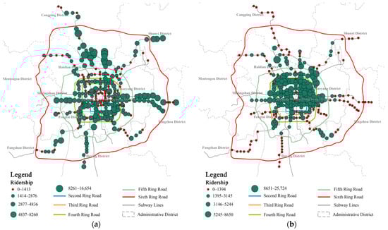 Spatial distribution of metro ridership during the morning peak hours: (a) boarding ridership and (b) deboarding ridership.