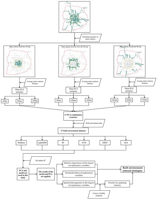 This study is based on the availability of multi-source big data. It considers the influence of different PCA combinations and models on the results, determines the models and PCA combinations suitable for this study, and explores the effect of the built environment on metro ridership and spatial heterogeneity. The overall framework of this study is illustrated in Figure 5. Firstly, Beijing was segmented into three zones, and the PCA of each zone’s metro station was determined based on the average station distance of the three zones. Subsequently, 27 PCA combinations for the metro stations were identified. Secondly, 27 built environment datasets were created based on the 27 PCA combinations. Thirdly, six models—eXtreme Gradient Boosting (XGBoost), Light Gradient Boosting Machine (LightGBM), Random Forest (RF), Support Vector Machine (SVM), Gradient Boosting Decision Tree (GBDT), and Ordinary Least Squares (OLS)—were constructed using the morning peak hour boarding and deboarding ridership as dependent variables. By comparing the results of six models, the suitable models and PCA combinations for this study were determined. Finally, the study examined the impact of the built environment on metro ridership and spatial heterogeneity using appropriate models and PCA combinations. Furthermore, priority update metro stations were selected based on the morning peak hour boarding and deboarding ridership, and targeted urban renewal strategies are proposed. This study presents new ideas for implementing more accurate strategies to update the built environment around metro stations.