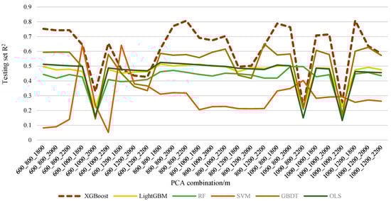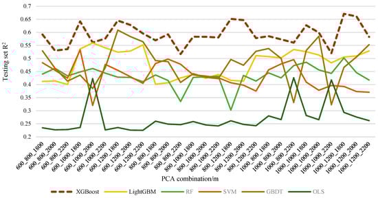 In this study, we compared the R2 of the XGBoost testing set for each PCA combination with the R2 of the LightGBM, SVM, RF, GBDT, and OLS models, respectively. We found that the R2 of the XGBoost model is higher than that of other models, indicating that the XGBoost model has a better modeling effect in capturing nonlinear relationships compared to the other models in this study. Most existing studies directly describe that the model’s goodness of fit is better. However, different data may be suitable for different models, and they have not conclusively demonstrated that the model in the paper is better [19,20,21,26,40,60,61]. This study solves the issue of the existing studies merely stating that using the model is better without providing evidence to support this claim. Although the XGBoost model has been compared with other models in existing studies [11], only the mean value of R2 was collected in their studies, and not all the results were shown. However, all the results from our research were presented, further substantiating the advantages of the XGBoost model. Furthermore, current studies emphasize the overfitting of models [26,40]. For example, Liu et al. [40] focused on the training set of models, while few scholars paid attention to the performance of the XGBoost model compared with other models.