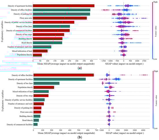 For boarding ridership, the explanatory variables have the following degree of influence: density of apartment facilities > density of office facilities > density of parking lots > floor area ratio > density of public service facilities > density of bus lines > density of commercial facilities > density of bus stops > building density > road density > number of entrances and exits > mixed utilization of land > population density (Figure 8a). At the same time, we find that among the explanatory variables given by the top three in the degree of influence, the density of apartment facilities has a positive influence. It proves that the larger the eigenvalue of the density of apartment facilities, the more significant the impact on boarding ridership. The density of office facilities and the density of parking lots have a negative impact on boarding ridership.