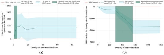 Based on the results of the relative importance of the explanatory variables in Section 4.2, we selected the top three explanatory variables in terms of the degree of influence to analyze the threshold effect, and the results are shown in Figure 9. Overall, complex nonlinear relationships and threshold effects exist between our selected explanatory variables and metro ridership. There is an overall positive correlation between the density of apartment facilities and boarding ridership. There is residential segregation in Beijing, and many residents choose the metro to get to work. Therefore, there are more residential areas with a large ridership. The effect of the density of apartment facilities on ridership rises rapidly when the density of apartment facilities lies between 0 and 5 quantity/km2 (Figure 9a). This range is referred to as the threshold range that significantly influences changes in SHAP values, and we have labeled the threshold range for the explanatory variables in each figure with green markers. As for the density of apartment facilities, which is the most important variable affecting boarding ridership, we found that the higher density does not significantly impact ridership. The effect tends to be unchanged when the density of apartment facilities is greater than 32 quantity/km2. The possible reason is that when there are too many residential areas, the metro station becomes overloaded and is unable to accommodate increased ridership. The thresholds for the density of office facilities range from 300 to 550 quantity/km2, and the impact on ridership tends to be unchanged when the density of office facilities is greater than 550 quantity/km2 (Figure 9b). The possible reason is that the plot ratio for office land is typically high, and increasing the number of office land does not necessarily mean an increase in land area, so there is still available residential land. The threshold range of car park density is 15–22 quantity/km2, while its effect on ridership tends to be unchanged when the car park density is greater than 85 quantity/km2 (Figure 9c). The possible reason is that residents have a specific need for parking lots; if the demand exceeds it, the parking lots will become redundant.