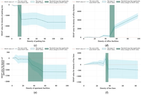 For deboarding ridership, the effect of the density of office facilities on ridership increases with increasing eigenvalues and does not reach a leveling trend. This may be because office facilities are now more located in urban centers, with fewer residential facilities in these areas. Therefore, increasing the distribution of office facilities will always increase foot traffic. Meanwhile, the threshold range of the density of office facilities is 48–55 quantity/km2 (Figure 9d). When the density of apartment facilities and the density of bus lines reach 57 quantity/km2 and 38 km/km2, their impact on ridership tends to stabilize. The possible reason is that residents have a certain demand for public transport, so an unlimited increase in the number of public transport lines cannot increase ridership. Meanwhile, the threshold range for the density of apartment facilities was 30–55 quantity/km2 (Figure 9e), and the threshold range for the density of bus lines was 32–38 km/km2 (Figure 9f).