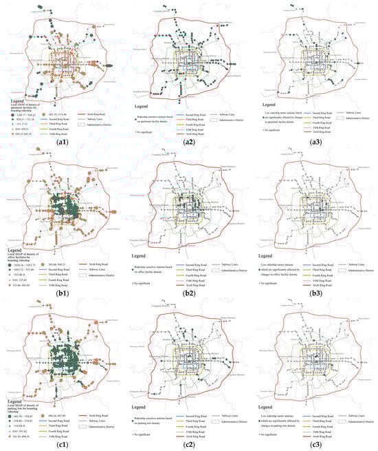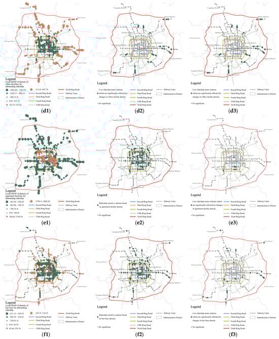 A map of the spatial distribution of the SHAP values of the environmental explanatory variables and a map of the prioritized update sites were constructed: (a1) SHAP of the density of apartment facilities for boarding ridership; (a2) ridership-sensitive stations based on the density of apartment facilities for boarding ridership; (a3) intersection of low ridership stations and sensitive stations based on the density of apartment facilities for boarding ridership and boarding ridership; (b1) SHAP of the density of office facilities for boarding ridership; (b2) ridership-sensitive stations based on the density of office facilities for boarding ridership; (b3) intersection of low-ridership stations and sensitive stations based on the density of office facilities for boarding ridership and boarding ridership; (c1) SHAP of the density of parking lots for boarding ridership; (c2) ridership-sensitive stations based on the density of parking lots for boarding ridership; (c3) intersection of low-ridership stations and sensitive stations based on the density of parking lots for boarding ridership and boarding ridership; (d1) SHAP of the density of office facilities for deboarding ridership; (d2) ridership-sensitive stations based on the density of office facilities for deboarding ridership; (d3) intersection of low-ridership stations and sensitive stations based on the density of office facilities for deboarding ridership and deboarding ridership; (e1) SHAP of the density of apartment facilities for deboarding ridership; (e2) ridership-sensitive stations based on the density of apartment facilities for deboarding ridership; (e3) intersection of low-ridership stations and sensitive stations based on the density of apartment facilities for deboarding ridership and deboarding ridership; (f1) SHAP of the density of bus lines for deboarding ridership; (f2) ridership-sensitive stations based on the density of bus lines for deboarding ridership; (f3) intersection of low-ridership stations and sensitive stations based on the density of bus lines for deboarding ridership and deboarding ridership.