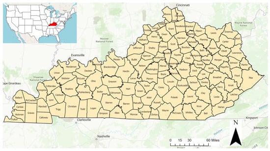 The state of Kentucky was chosen as the study area for several reasons. First, there are limited studies in the literature that focus on the impact of tornadoes in Kentucky (see Figure 1 to see the state and its counties). Second, the literature suggests that there has been an upward trend in tornado occurrences in some states, including Kentucky [28]. Therefore, this region should be investigated more, with a focus on tornado-induced damage. Finally, Kentucky has been found to have the seventh-worst economy out of the 50 states with a poverty rate of 14.9% [29]. Out of 120 counties, 54 of them in eastern Kentucky are located within the largest economically distressed region, with most classified as economically distressed [30].