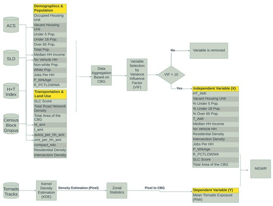 In this paper, vector-based tornado incidence data, as well as socioeconomic, demographic, and transportation-related data, were collected from several sources. ArcGIS Pro v3.0 was utilized to process these datasets. These datasets (i.e., American Community Surveys, Smart Location Database, and Center for Neighborhood Technology’s Housing and Transportation Affordability Index) are shown in Table 1, including variable names with explanations for all the variables. They will be explained in the next subsections.