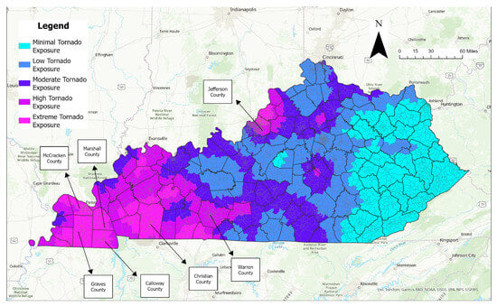 Tornado density distributions are shown in Figure 3, obtained by using five exposure zones and natural breaks (i.e., Jenks). This type of clustering is applicable for events with non-uniform distributions like tornadoes. Figure 3 shows tornado exposure between 1950 and 2022 for Kentucky. As seen in Figure 4, the findings of our study (Figure 3) show some similarities with respect to the risk zone classes of tornado day occurrences between 1950 and 2010, as depicted by Blinn in his study [16]. Similar to the study by Blinn [16], the west and southwest regions of Kentucky, namely Graves, McCracken, Marshall, Calloway, and Christian counties, experienced high tornado activity. In addition, it should be noted that in the northern parts of Jefferson County and all parts of Warren County, respectively, several highly populated counties, including the city of Louisville, had relatively high tornado exposure over the study period. On the other hand, tornado density was the lowest in the eastern parts of Kentucky (which are relatively less populated than other areas).