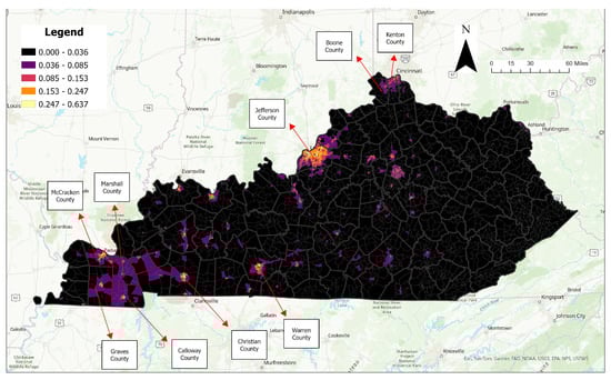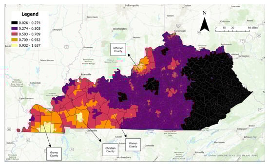 Figure 6, on the other hand, depicts vulnerable regions where both exposure and occurrences had high values. This was performed by multiplying normalized variables with a max score of 1. Figure 6 shows that CBGs in Jefferson County had the highest roadway vulnerability. In other comparatively highly populated counties like Kenton, Boone, and Warren, there was a relatively high roadway impact, even though there was comparatively less tornado impact in Kenton and Boone counties. On the other hand, in the southwest portion of the state, in counties like Graves, McCracken, Marshall, Calloway, and Christian, high roadway impact was observed more in central areas. This association can be explained by increased roadway network density in central connector areas.