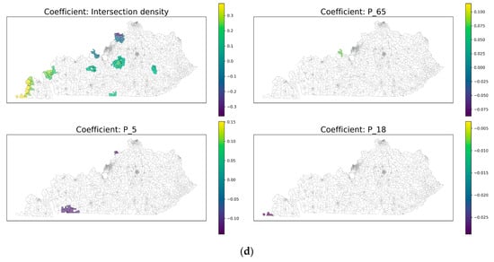 Distribution of coefficients over Kentucky: (a) intercept, Ac_land, P_WrkAge, and R_PCTLOWWA (percent of low wage workers); (b) D2A_JPHH (jobs per household), SLC_score, vacant_hou, and no_veh_hhs (no vehicle households); (c) median_household_income, ht_ami, t_ami, and residential density; (d) intersection density, P_65, P_5, and P_18.