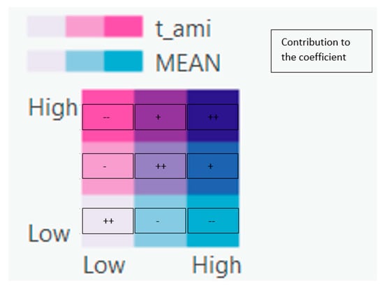 A bivariate relationship between the selected independent and dependent variables was used while explaining the effect of the sign. This relationship can be categorized into nine classes, as seen in Figure 9. Shades of pink express the explanatory variable, while shades of blue are used to express mean tornado exposure in the region. The signs drawn in a cell can be explained as a positive or negative contribution to the coefficient. For example, diagonal relationships should contribute as positive for high values of tornado exposure. That is, if the value of t_ami is high as well, it is expected that t_ami will have a positive correlation. This holds for the low values of t_ami and low values of mean tornado exposure. However, if the t_ami value is high when tornado exposure is low (as in the top left cell), the relation is expected to be negative. This inverse correlation is also evident for low values of t_ami when paired with high levels of mean tornado exposure, as depicted in the bottom-right cell. While inspecting variables, we referred to those relationships based on the cell color in Figure 9.