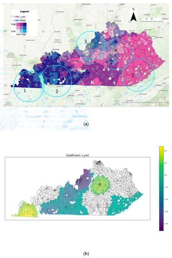 Spatial analysis of t_ami variable: (a) bivariate coloring of t_ami and mean tornado exposure and(b) distribution of significant t_ami coefficients (Numbers in the circles represent the buffers).