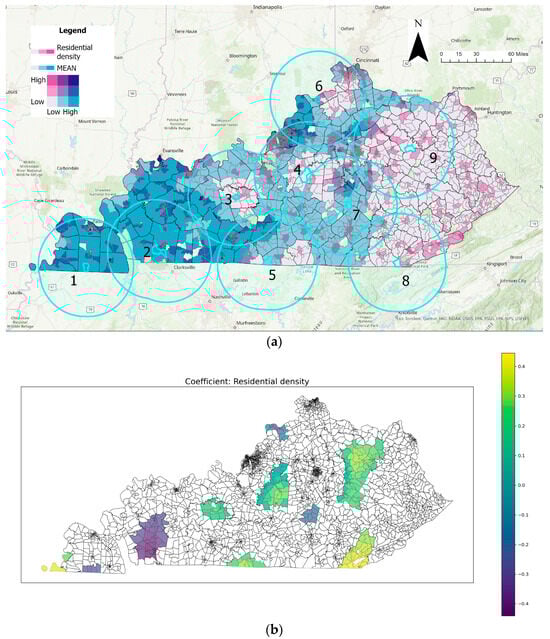 Spatial analysis of residential density variable: (a) bivariate coloring of residential density and mean tornado exposure and (b) distribution of significant residential density coefficients (Numbers in the circles represent buffers).