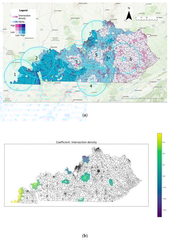 Spatial analysis of intersection density variable: (a) bivariate coloring of intersection density and mean tornado exposure and (b) distribution of significant intersection density coefficients (Numbers in the circles represent buffers).