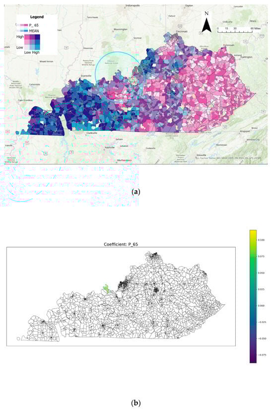 Spatial analysis of P_65 variable: (a) bivariate coloring of P_65 and mean tornado exposure and (b) distribution of significant P_65 coefficients.