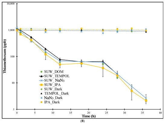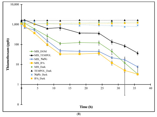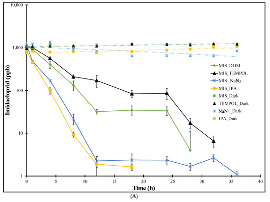 TEMPOL imidacloprid concentrations in the MIS treatment were significantly different between several time points (α ≤ 0.05; Figure 1; Table S4); however, between 0 and 1 h, no significant differences between concentrations were observed. After 8 h of UV exposure, imidacloprid concentrations between time points were significantly different from the initial time point. Further, statistical comparisons of imidacloprid concentrations were compared with respect to quenching agents (e.g., TEMPOL, NaN3, and IPA), where significant differences were observed specifically in the MIS TEMPOL treatment compared to the NaN3 and IPA treatments (α ≤ 0.05; Table S5). Similarly, significant differences were observed between thiamethoxam concentrations between time points after 8 h (α ≤ 0.05). Further, significant differences were observed between treatments with TEMPOL compared to NaN3 and IPA (α ≤ 0.05), which indicate that the addition of TEMPOL significantly inhibited the degradation processes of both imidacloprid and thiamethoxam, while the treatments with NaN3 and IPA significantly enhanced the degradation of imidacloprid and thiamethoxam. Wang et al. [42] observed similar occurrences following the addition of TEMPOL, which significantly inhibited the degradation process of ketoprofen, while isopropanol had a negligible effect on the degradation process [42].