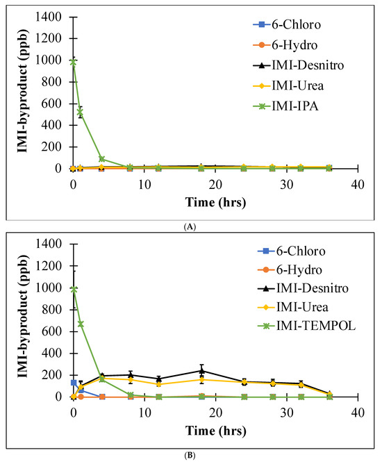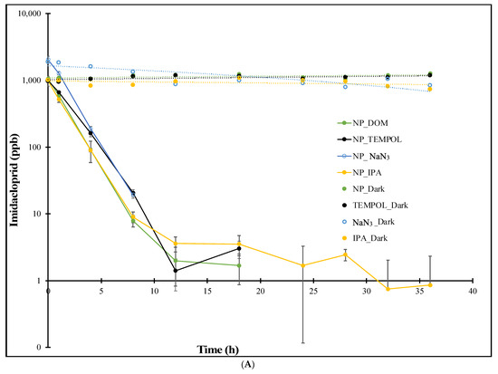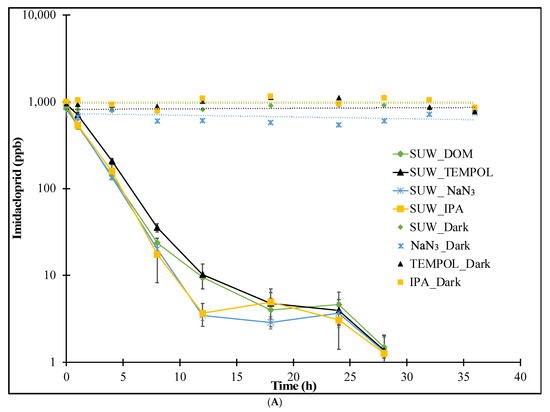 Imidacloprid removal rates were significantly different between time points within 8 h, while significant differences were observed within 12 h for thiamethoxam (α ≤ 0.05; Table S14). Further, imidacloprid removal rates were significantly different between treatments, with IPA being significantly different compared to TEMPOL and NaN3 for imidacloprid (α ≤ 0.05; Table S15). In general, treatments with TEMPOL inhibited the degradation process for both compounds, while NaN3 and IPA enhanced the degradation process.