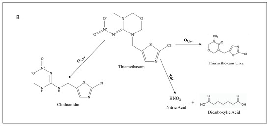 Figure 4. Potential degradation pathways of (A) imidacloprid and (B) thiamethoxam under simulated sunlight adapted from Kurwadkar et al. (2016) [40].