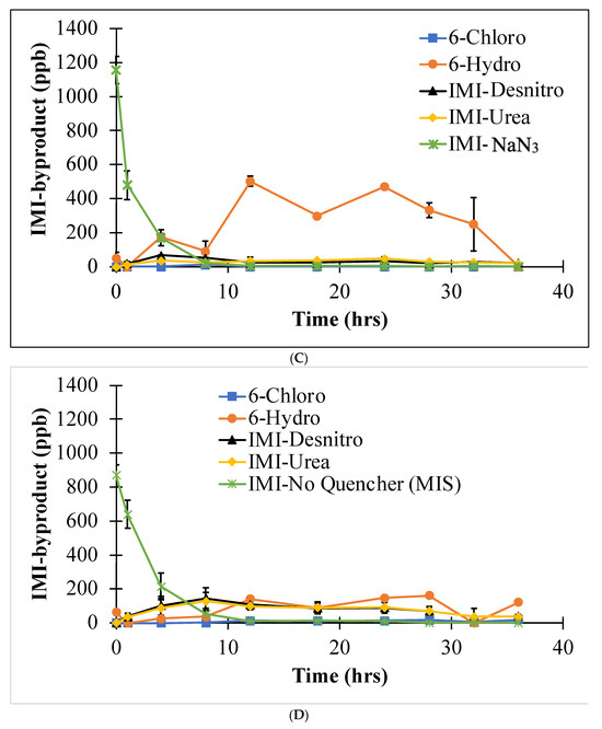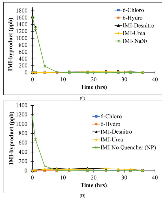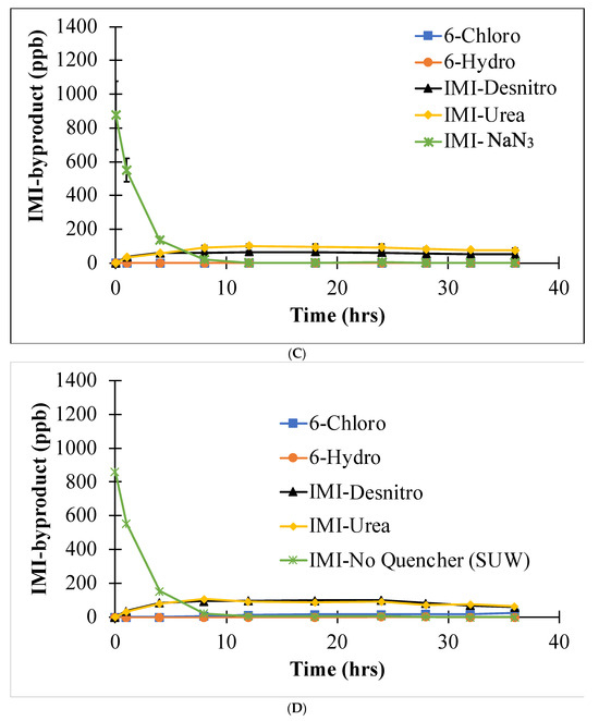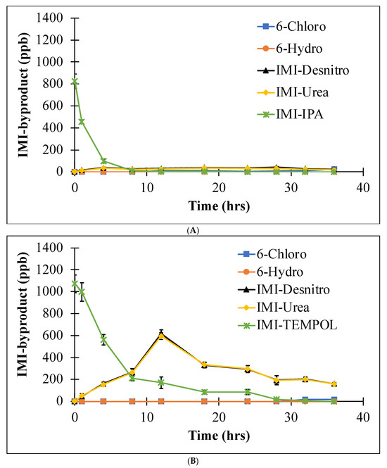 Finally, the formation of imidacloprid urea and imidacloprid desnitro was also observed in all NanopureTM water matrices (Figure 7), with significant differences observed in the formation of imidacloprid urea and imidacloprid desnitro between the TEMPOL and control treatments compared with the other treatments (α ≤ 0.05; Table S21). Thiamethoxam urea formation in NanopureTM water was also observed between treatments (Figure S3). While no significant differences were observed between the TEMPOL, control, and NaN3 treatments, IPA resulted in significantly different concentrations of thiamethoxam urea (α ≤ 0.05).