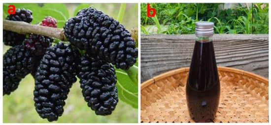 The mulberry fruit (Figure 1a), abundantly distributed in Asia, Europe, America, India, and Africa, belongs to the Moraceae family [,]. Noteworthy species include Morus alba, Morus nigra, and Morus rubra, which are known for their medicinal properties [,,]. China leads in regard to cultivation, boasting the largest area and production volumes globally []. The geographical hotspots for mulberry cultivation in China include Guangdong, Zhenjiang, Shanghai, Shaanxi, Xinjiang, Beijing, and other areas []. Globally, the primary use of mulberries revolves around their significance in silkworm production [], as these insects exclusively consume mulberry leaves. China has led in terms of mulberry cultivation [], boasting the largest area and production volumes of ~700,000 ha and 1.82 × 107 tons, respectively [], followed by India (~280,000 ha). While other countries, such as Thailand [] and Brazil, maintain some mulberry production, their scales are considerably smaller, for instance, 35,000 ha and 848.6 kg/acre/year [], respectively.