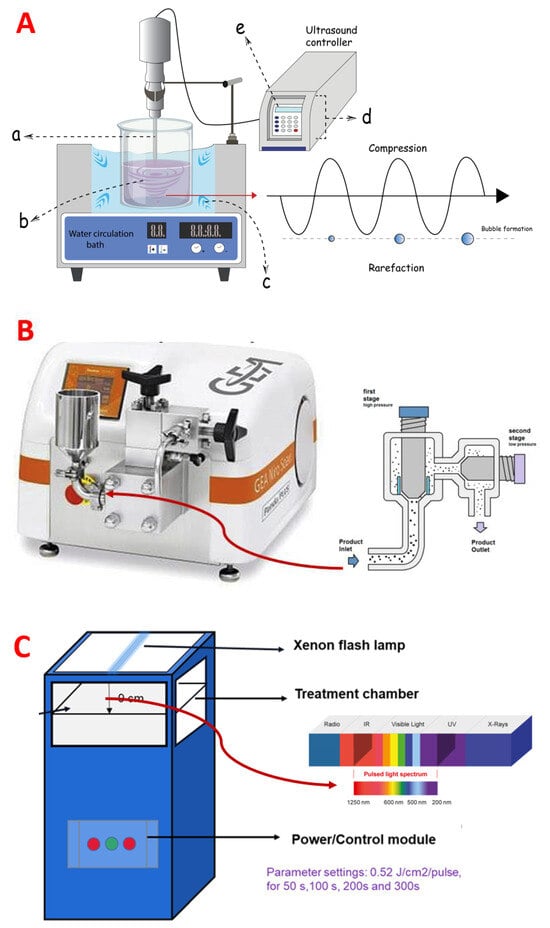 Experimental setup for (A) ultrasound, (adapted from Boateng et al. [] with modifications); (B) ultra-high-pressure homogenization, (adapted from Patrignani et al. [] with modifications), and (C) pulsed light (adapted from Li et al. [] with modifications) pretreatment, for mulberry vinegar processing.