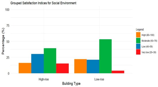 As suggested by [59], the calculated SI scores were grouped into four quartiles: very low (20–39%), low (40–59%), moderate (60–79%), and high (80–100%). The mean satisfaction score of 60.62 for high-rise estates and 67.48 for low-rise estates was calculated. This suggests that, on average, low-rise estates have higher satisfaction scores than high-rise estates. In terms of the satisfaction distribution by percentages, low-rise estates have a notably lower percentage of very low satisfaction (4%) compared to high-rise estates (15%) (Figure 2). Low-rise estates also have a lower percentage in the low satisfaction category (21%) compared to high-rise estates (30%) and have a higher percentage of estates with moderate satisfaction (53%) compared to high-rise estates (39%).