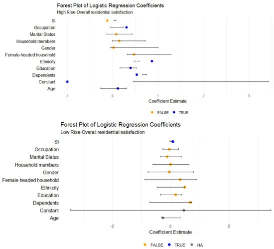 Logistic regression analysis was conducted separately for high-rise and low-rise estates to assess the predictor variables that influence overall residential satisfaction. Results from the logistic regression models (high-rise overall residential satisfaction and low-rise overall residential satisfaction) are presented in the forest plot in Figure 3. The forest plot is used to visualise the logistic regression results, statistically significant predictors have coloured dots, and the corresponding horizontal lines which represent confidence intervals, do not cross zero. The figure includes each explanatory variable’s estimated coefficients, 95% confidence intervals, and p-values. For the high-rise model, the age, education, marital status, ethnicity, female-headed household, dependents, household members, and occupation variables all showed positive associations with overall residential satisfaction, although none of these relationships were statistically significant. In high-rise housing, a negative coefficient of −0.12 for SI indicated higher values of SI were associated with lower odds of overall satisfaction in high-rise housing.