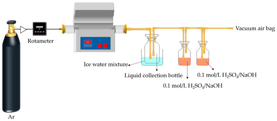 The experiments were conducted in the atmosphere of argon, as shown in Figure 1. About 10 g of COS, MIPW, or COS/MIPW mixture with 10, 20, 30 and 50 wt.% (daf, mass ratio) MIPW was placed into a quartz boat. The heating program was as follows. The mixture was rapidly heated from room temperature to 650 °C within 65 min at a rate of 5 °C/min and held for 60 min. To condense the liquid-phase products (tar and water), a conical bottle was placed in an ice–water mixture, and a gas bottle with H2SO4/NaOH (100 mL, 0.1 mol/L) was used to absorb the NH3/HCN products. The remaining gas-phase products were collected in a vacuum airbag. Once the pyrolysis process was finished, the quartz boat was removed after it had cooled down. The char was taken out from the quartz boat and weighted to calculate the char yield (wt.%, on the basis of dry and ash-free raw materials). The mass of liquid products was calculated by weight increments in the conical flask (wt.%, on the basis of dry and ash-free raw materials). Gas phase yield was calculated by difference (wt.%, on the basis of dry and ash-free raw materials).