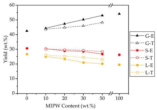 MIPW was mixed with COS in a certain proportion (0,10, 20, 30, 50 and 100 wt.%), and then a co-pyrolysis experiment was performed. The distribution of the pyrolysis products is shown in Figure 4.