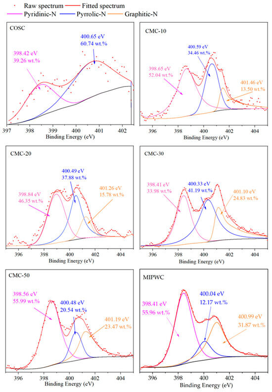 To study the effect of MIPW addition on the types and content of N-containing functional groups in biochar, we used XPS. The N1s peaks of biochar were fitted. XPS shows that the N-containing functional groups in biochar included pyrrolic-N (398.6 ± 0.3 eV), pyridinic-N (400.5 ± 0.3 eV) and graphitic-N (401.3 ± 0.3 eV) [2]. As shown in Figure 5, the N1s spectral lines in COSC prepared by COS pyrolysis alone were disordered, indicating that the content of N in COSC was very low, and there were only two N-containing functional groups, pyridinic-N and pyrrolic-N. The biochar obtained from MIPW pyrolysis alone has clear N1s spectral lines, and with high N content, there are large amounts of pyridinic-N, pyrrolic-N and graphitic-N; these results are consistent with the results of Grimm et al. [19].