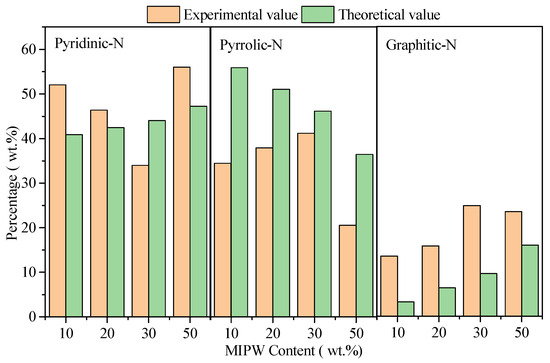Overall, with the increase in the proportion of MIPW in the raw materials, the content of HCN-N and NH3-N (liquid) showed a slight increase; the contents of organic-N and N2-N were basically unchanged; and the contents of NH3-N (gas), pyridinic-N and graphitic-N firstly increased and then decreased.