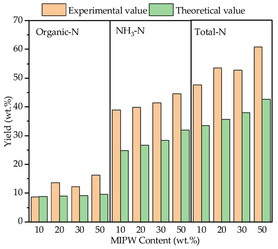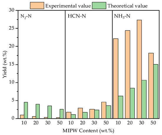 From the data shown in Figure 7, the experimental values of NH3-N and HCN-N yield in the gas phase were higher than the theoretical values, and the experimental value of N2-N yield was much lower than the theoretical value. With the increase in the proportion of MIPW, the difference between experimental values and theoretical values reaches the maximum at 30 wt.% and then decreases at 50 wt.%. It shows that the synergistic effect of co-pyrolysis promotes the formation of NH3-N and HCN-N and inhibits the formation of N2-N.