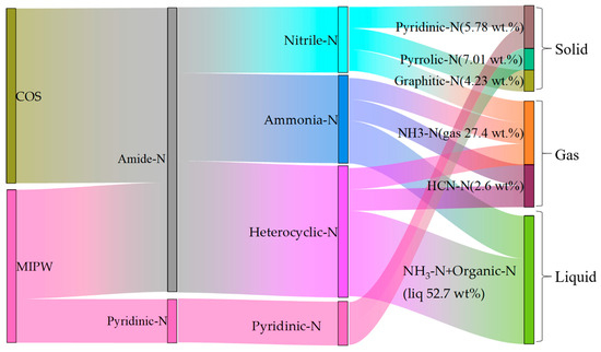 In terms of the migration of N content from raw materials to products, the products could be sequenced from high to low N content as follows: liquid phase (47.50~57.72 wt.%), gas phase (24.92~30.33 wt.%), and solid phase (27.58~16.31 wt.%), with the MIPW proportion being from 10 wt.% to 50 wt.% in raw materials.