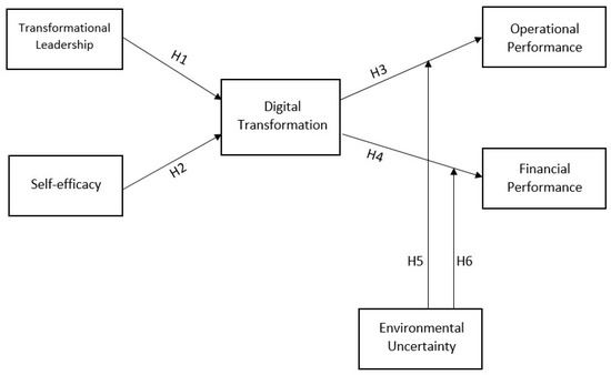 Environmental uncertainty is seen as both a danger and an opportunity for firms. In a situation of uncertainty, it is difficult to make effective decisions, take the right steps, and remain competitive. However, the opposite is true when firms can adapt to change, new environmental information is available, and opportunities can be anticipated because while other firms cannot achieve this, taking the right action in case of uncertainty makes a significant difference. In this respect, digital transformation is critical for firms. As uncertainty increases, digital transformation provides more advantages for firms to maintain or increase their competitiveness and improve performance outcomes [84]. Rajala and Hautala-Kankaanpää [85] stated that digital transformation enables for the reduction of environmental risks and minimizes uncertainty for firms. Moreover, it enables firms to discover new opportunities and have a greater share of the market. Therefore, these firms have a higher performance [86]. Li [21] also stated that digital transformation is a determinant of better performance in situations of high uncertainty and change as it enables the firm to differentiate itself faster and more accurately from its competitors. Thus, the fifth and sixth hypotheses are as follows.